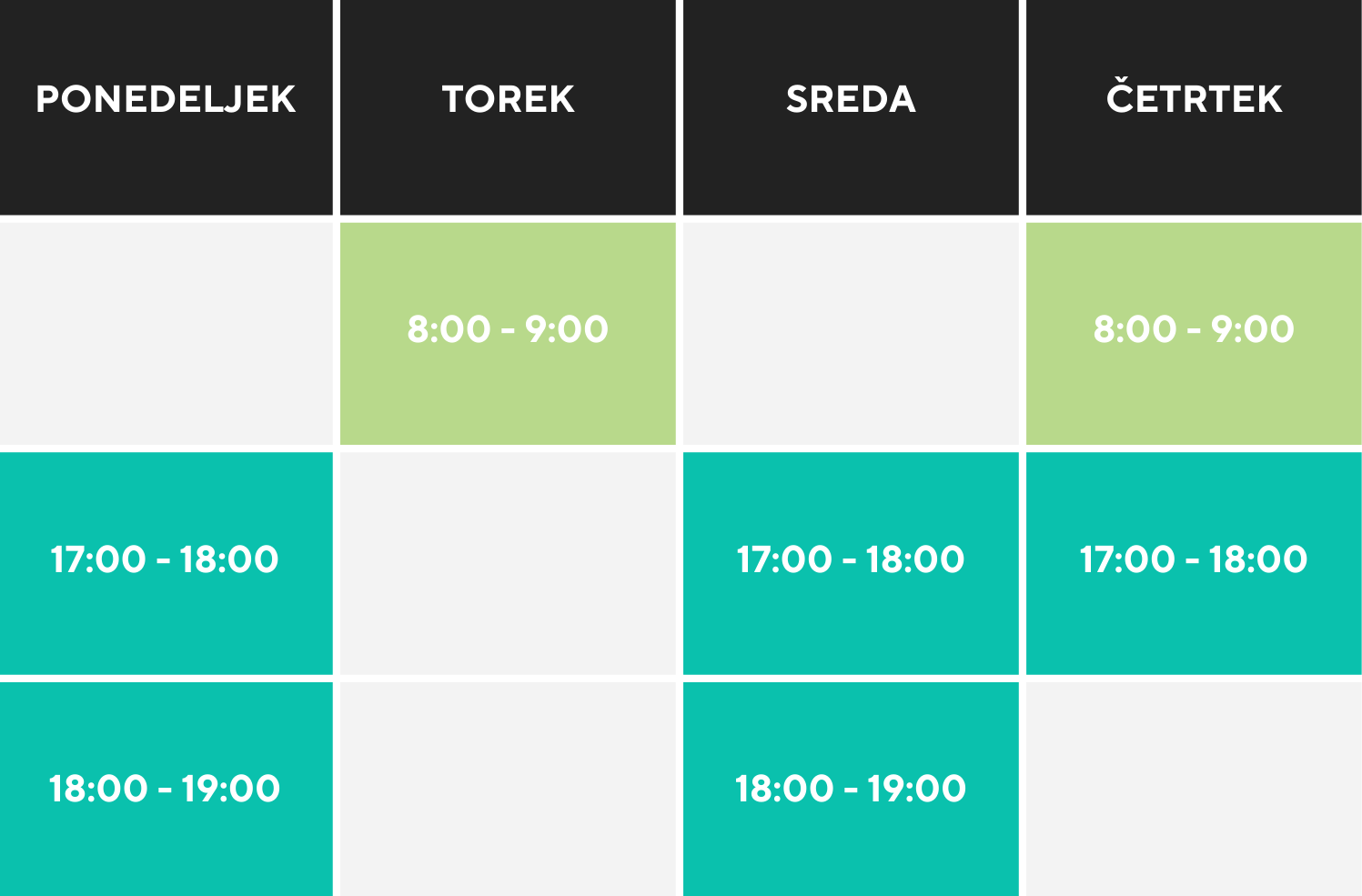 Ponedeljek: 17:00 – 18:00 in 18:00 – 19:00